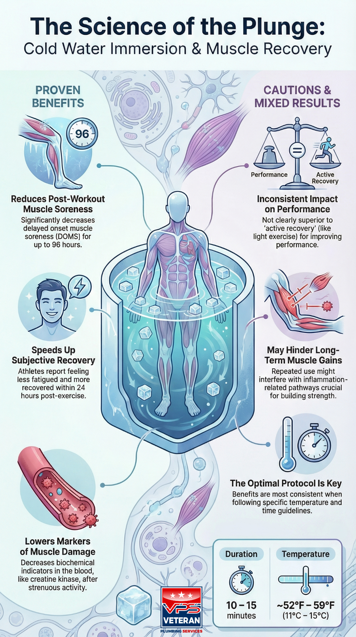 More recent research supports this finding with more substantial evidence. A 2025 clinical review reported that cold water immersion immediately after intense exercise improved perceived recovery and reduced muscle soreness within the first 24 hours, particularly when short immersion (under 15 minutes) in water below approximately 59°F (15°C) was used. This effect was consistent across a broad set of randomized controlled trials.
