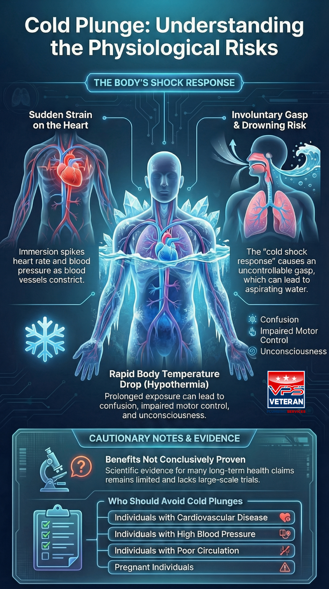Cold plunges and cold-water immersion can offer short-term benefits, including reduced perceived muscle soreness after exercise, temporary reductions in stress, modest improvements in sleep quality, and enhanced subjective recovery. However, scientific evidence supporting long-term health benefits, including immunity, mood regulation, reduced systemic inflammation, or clinical psychological improvements, is limited and inconsistent. Cold immersion also carries significant risks such as cardiovascular strain, the cold shock response, hypothermia, and breathing dangers, especially for individuals with underlying health conditions. Overall, cold plunges may be helpful as a targeted recovery or stress-management tool for healthy adults when used cautiously, but they are not a universally proven health intervention and should be approached with moderation and medical guidance for at-risk populations.