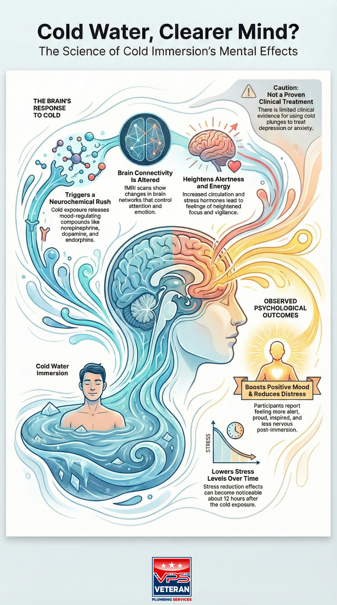 Short-term cold immersion has been linked to increased alertness and reduced stress in some studies, and people often report feeling more energetic or positive afterward.