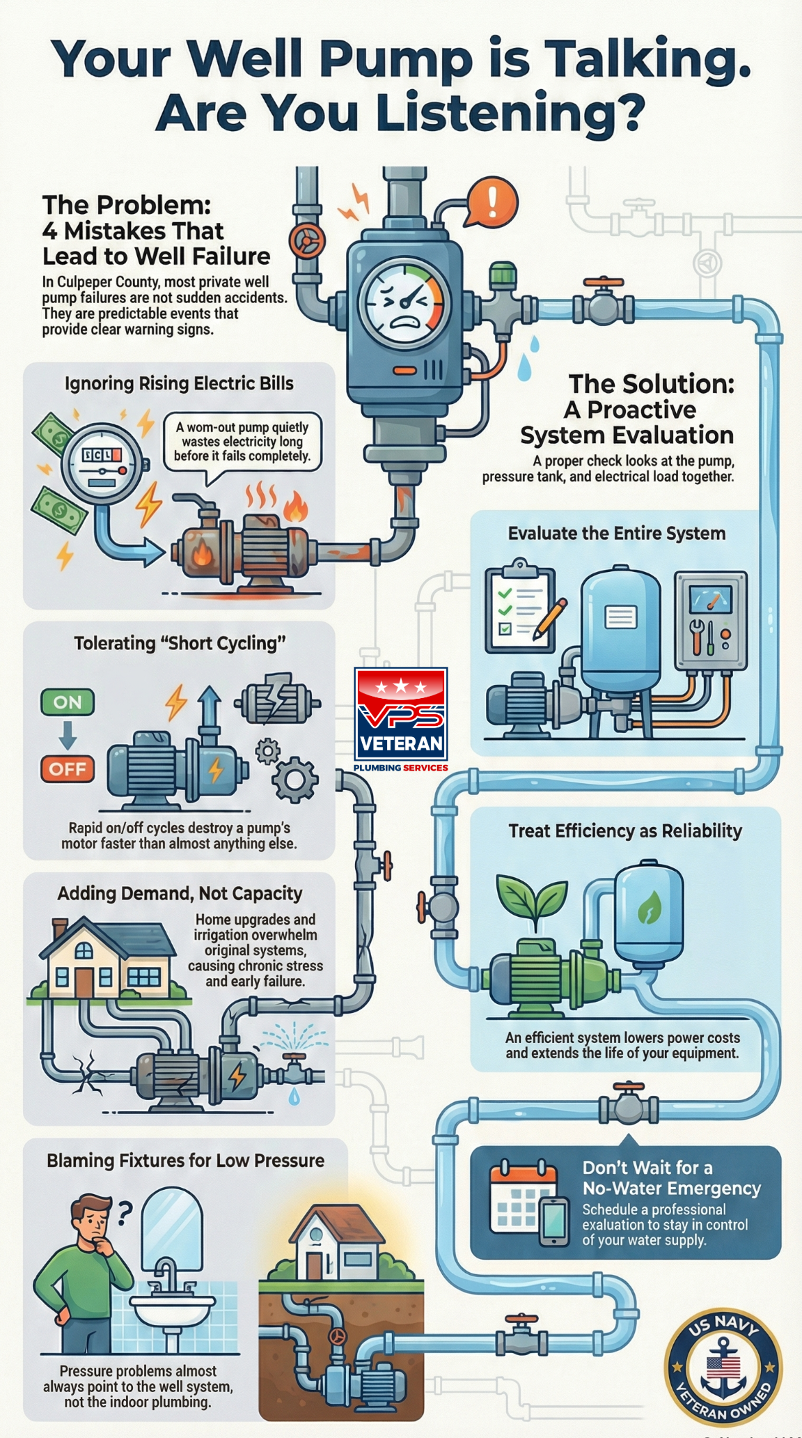 If your Culpeper County home relies on a private well, you do not have a water utility standing behind you. Your water stops the moment your pump, pressure tank, pressure switch, or electrical supply fails to do its job. Most well failures are not random. They build for months through short cycling, longer pump runtimes, clogged filters from sediment, and rising electric bills that homeowners dismiss as usual. The most dangerous moments are peak summer demand and power restoration after outages, when worn motors and stressed controls finally give out. If you live near Brandy Station, Stevensburg, Richardsville, the Raccoon Ford Road corridor, or outside the Town of Culpeper, the right move is to treat pressure changes and electric bill increases as early failure warnings, not minor annoyances, because acting early is how you avoid a complete loss of water and a costly emergency replacement.