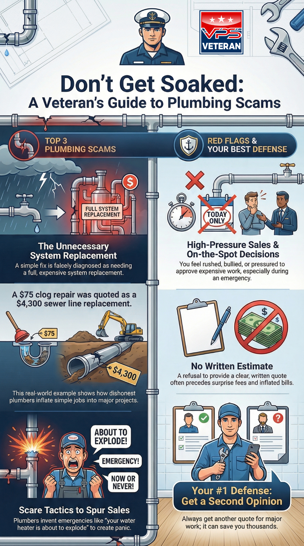 Unscrupulous plumbers often use high-pressure sales tactics, misleading scare stories, and confusing pricing schemes to overcharge homeowners for unnecessary repairs. By recognizing red flags like “up-selling” perfectly good fixtures or pushing full system replacements during emergencies, you can protect your wallet and your home. Veteran Plumbing Services operates differently: founded on Navy core values, we prioritize integrity, transparent pricing, and a commitment to only fix what is actually broken.
